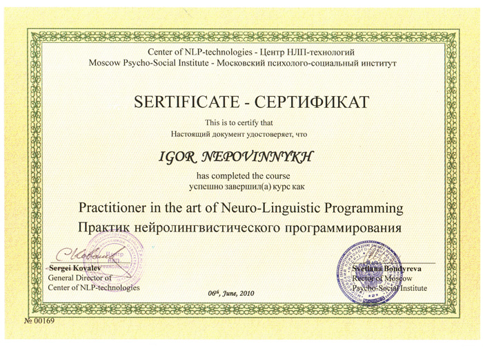 В плане образования, я проходил годовую стажировку у одного из сильнейших психотерапевтов в современной России, имя которого Сергей Викторович Ковалёв. Образование сильно расширило моё мировоззрение, но могу признаться честно - в своей практике мало применяю из изученного. Я практик по своей сути, поэтому, в работе применяю только те технологии, которые отработал на самом себе. Однако, сертификат, для ценящих теоретическое образование, размещу.